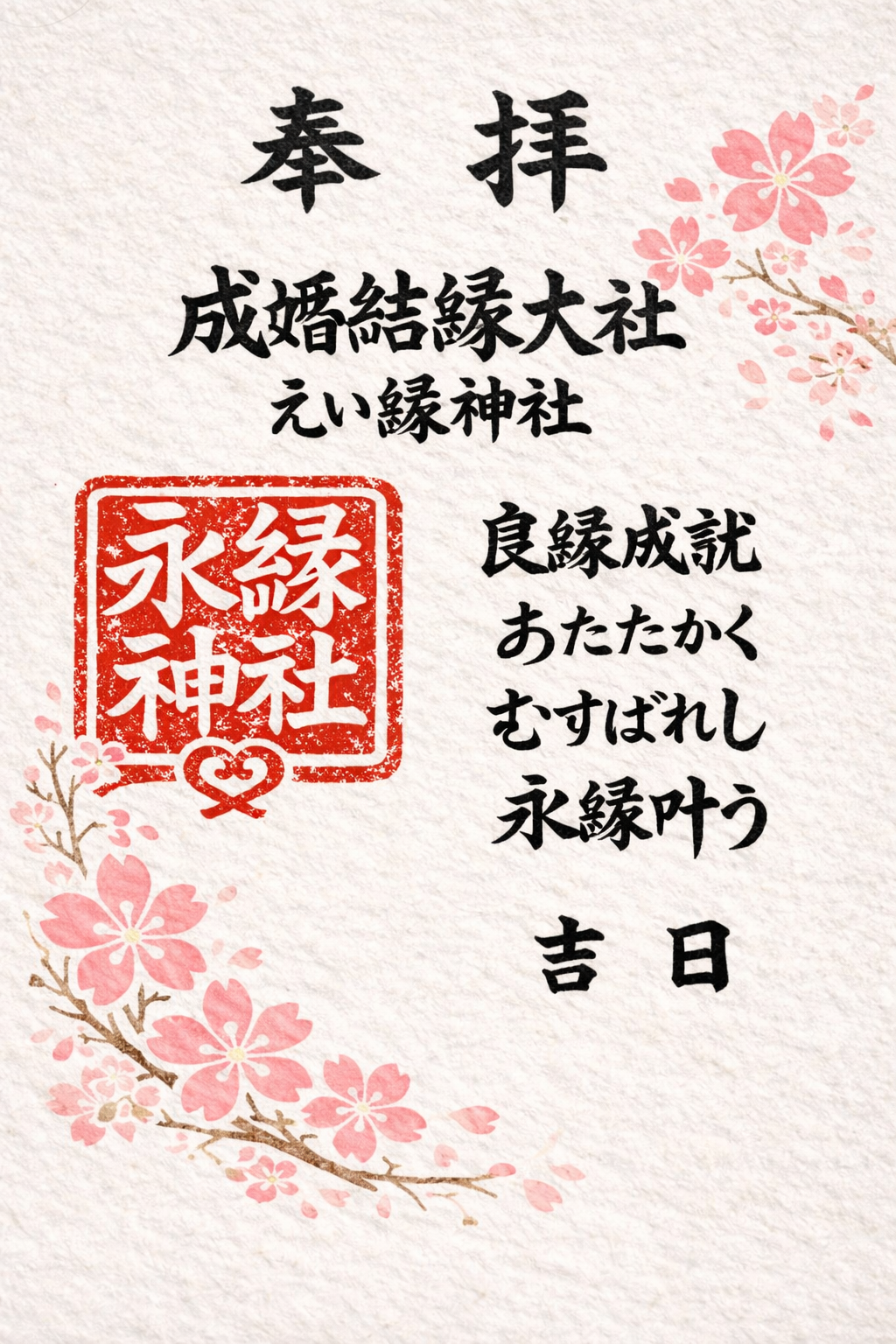 こちらは、成婚結縁大社 えい縁神社のデジタル御朱印です。 ご縁を大切にしながら、一歩ずつ行動を重ねている方へ、良縁成就の願いを込めて、授与しております。