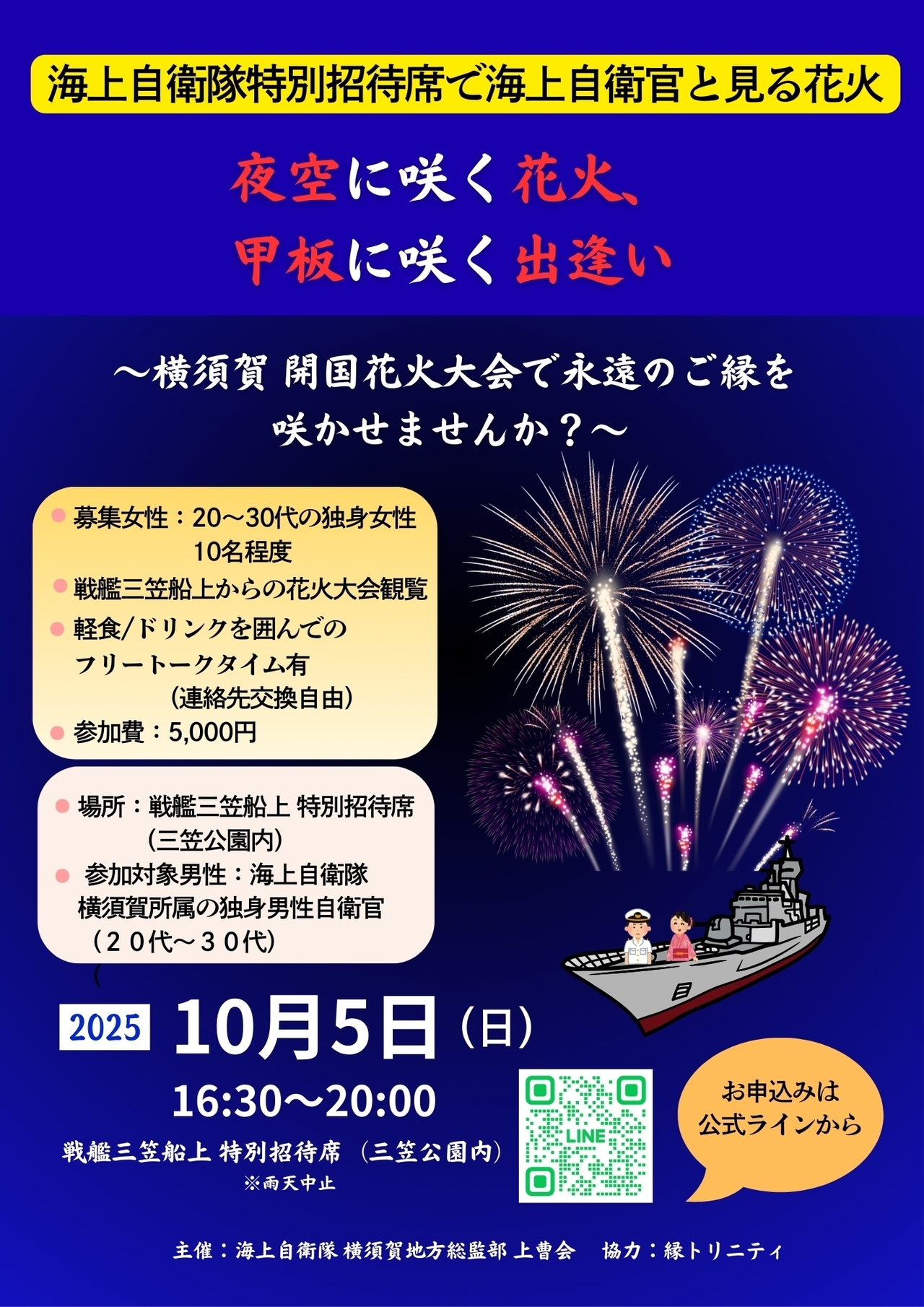 応募をされる方は、公式LINEにご登録の上、「10.5横須賀花火希望」とメッセージをご送信ください。折り返し、LINEにて申し込みのご案内を送らせて頂きます。